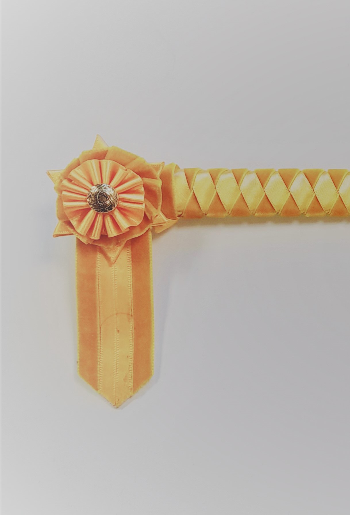 Each of our Boston Browband’s are hand-plaited on 3/4″ (19mm) leather featuring a diamond design plait velvet ribbon bordering central satin and lurex ribbons.