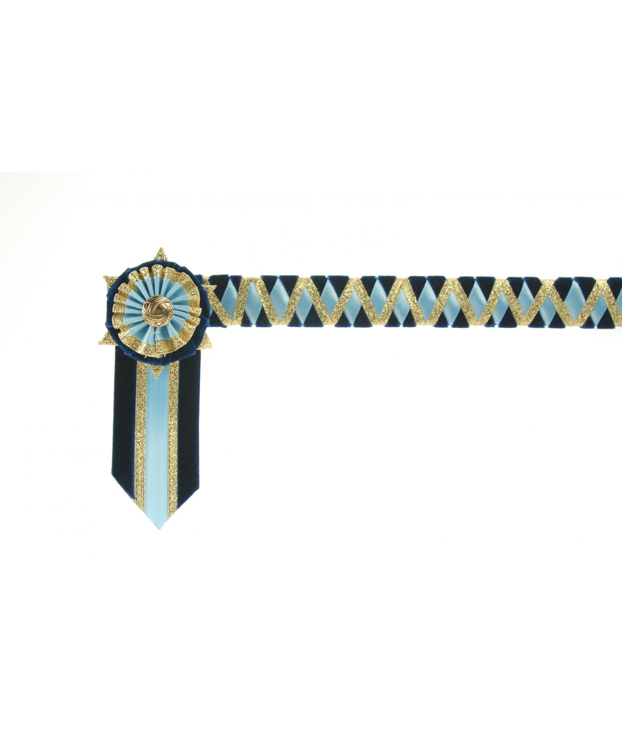Each of our Ludlow Browband’s are hand-plaited on 3/4″ (19mm) leather using velvet ribbon bordering central satin and lurex ribbons. Our diamond design features a zig-zag lurex overlay, two three-layered rosettes situated on a six-point star and classic V-shape tabs. Made in England